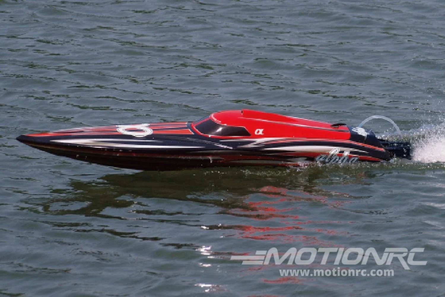 Display this racing boat on your mantle or enjoy it on the water with this functional RTR (Ready to Run) model. Delivered Ready to Run (RTR), the Alpha can be operating within minutes of opening the box, using the included 2.4Ghz radio transmitter, 2S batteries, and battery charger.