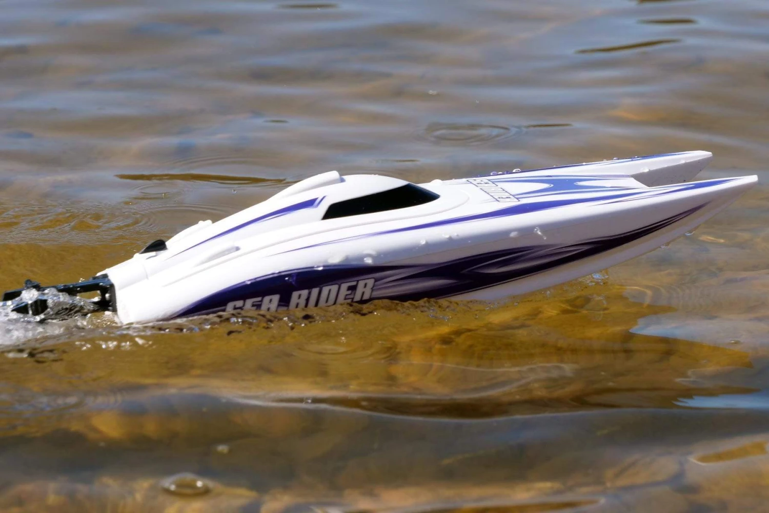 | CAD-designed Hull The Searider’s ABS plastic hull is digitally-optimized to deliver outstanding performance and razor-sharp handling in compact areas like pools and small ponds. A convenient boat stand is also included for when the boat is in dry dock! | ![]() |