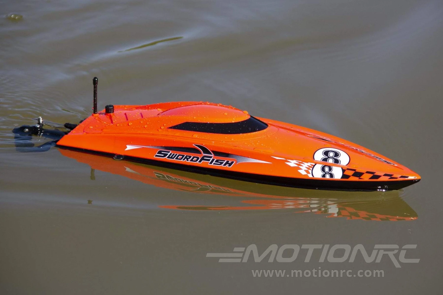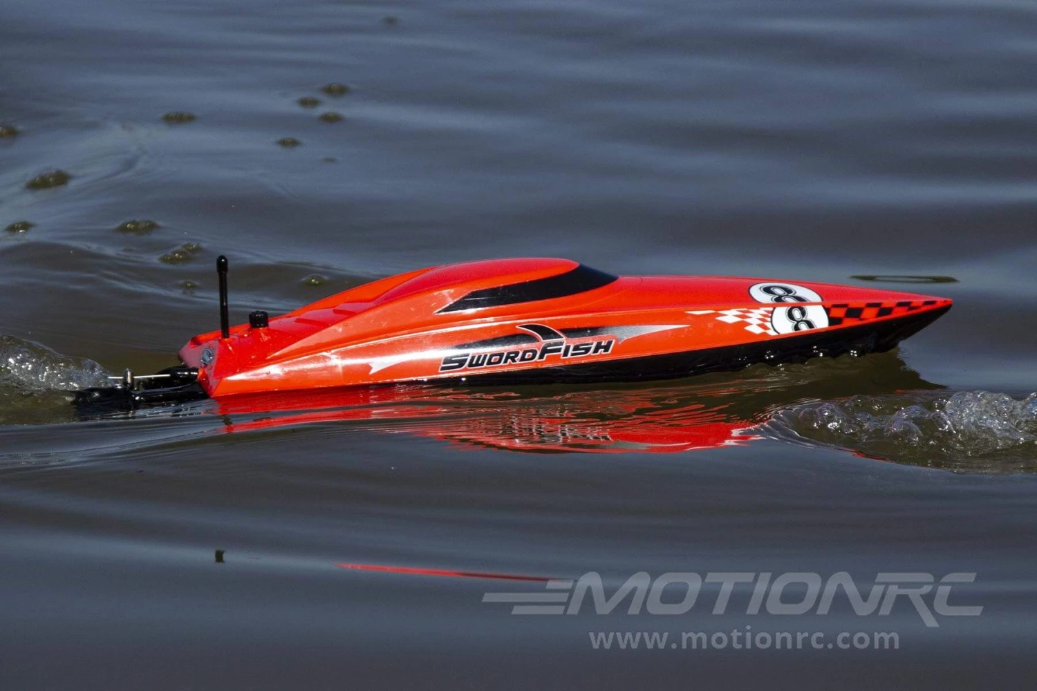 Display this racing boat on your mantle or enjoy it on the water with this functional RTR (Ready to Run) model. Delivered Ready to Run (RTR), the Swordfish can be operating within minutes of arrival, using the included 2.4Ghz radio transmitter, 2S battery, and battery charger. Only four AA batteries are required to begin racing!