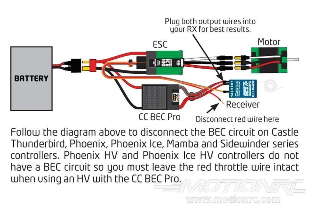 The Castle BEC Pro is a staple for RC jets and prop planes running high voltage LiPo packs. If you want to add a BEC capable of dealing with LiPo packs up to 12S (10S in planes) while adding quality and reliability, this is the perfect upgrade. This will ensure you have plenty of power for your servos, retracts, receiver, lights, and other accessories. A Proper setup using this Castle 20A BEC will help prevent brown outs which some popular receiver brands are prone to. The BEC includes two wires with JR connectors to connect to the receiver and bare wires on the other side. Please see diagram or instructions for proper connection.