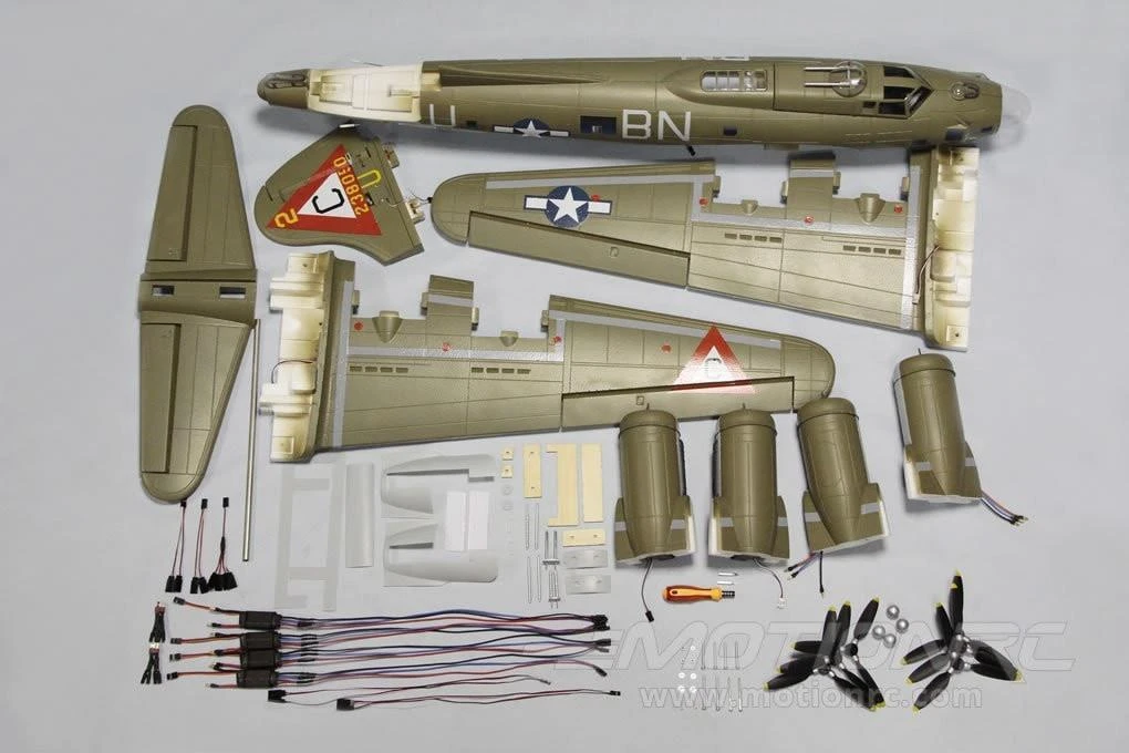 This Freewing B-17 is one amazing plane to see in the sky and on the ground. Not only is the Freewing B-17 huge, but the scale looks, counter-rotating props, split flaps, and robust shock absorbing landing gear really attract attention. With way more than scale power, the Freewing B-17 is very agile for its size and the sound from the four 1350Kv motors cannot be beat. While assembly is simple, do be prepared to spend a few hours building the plane.