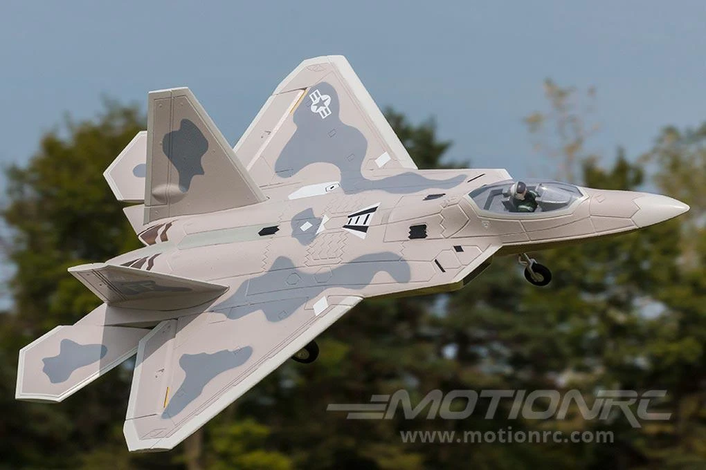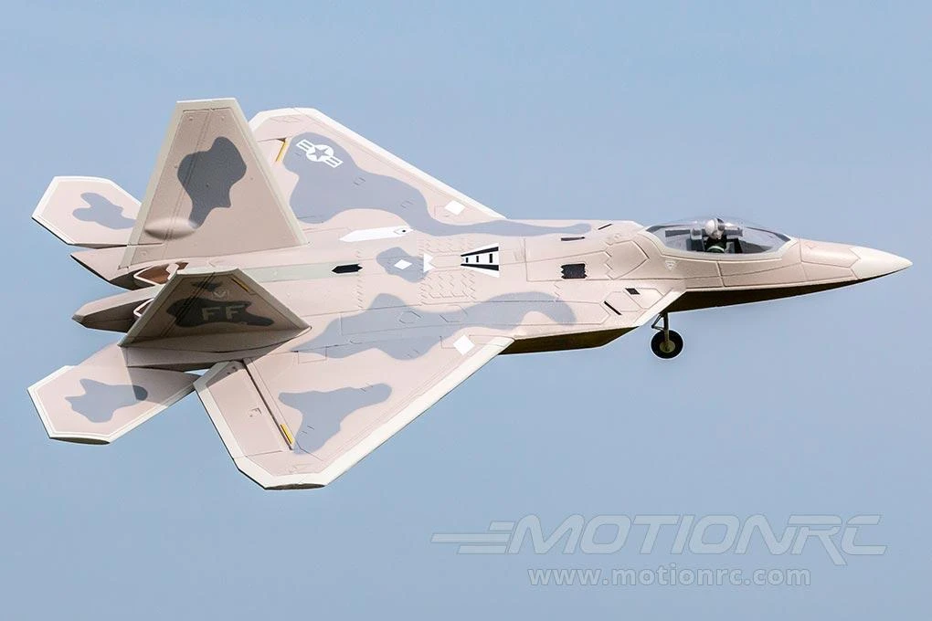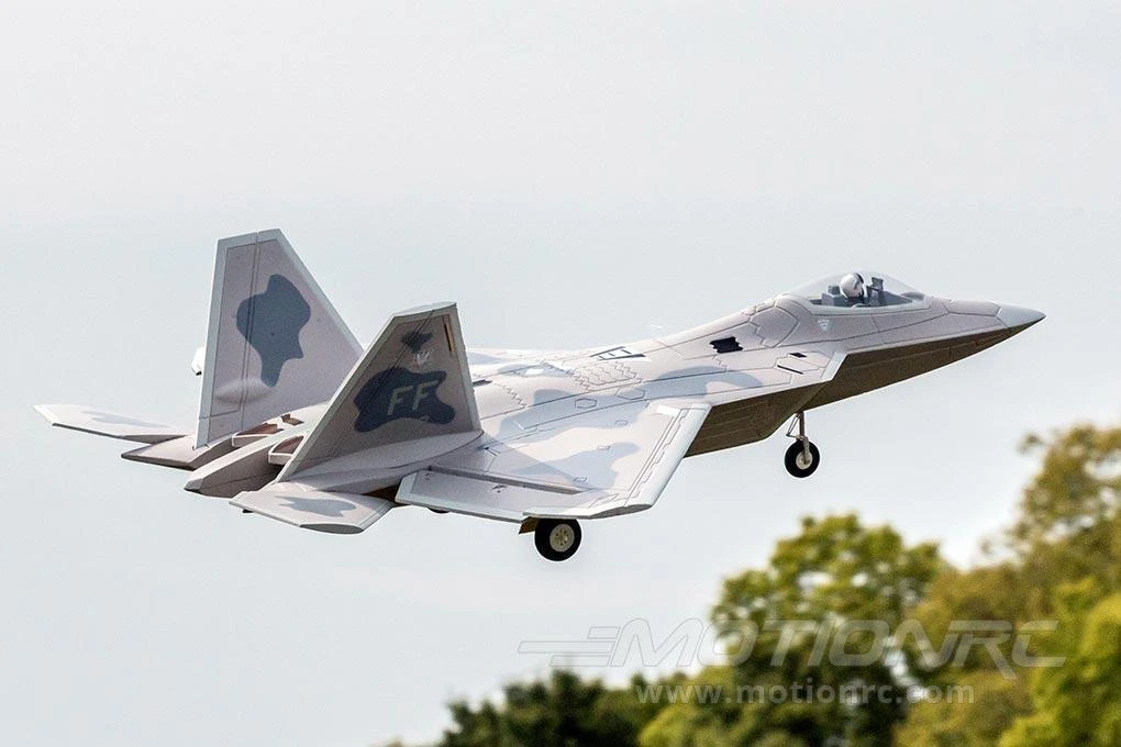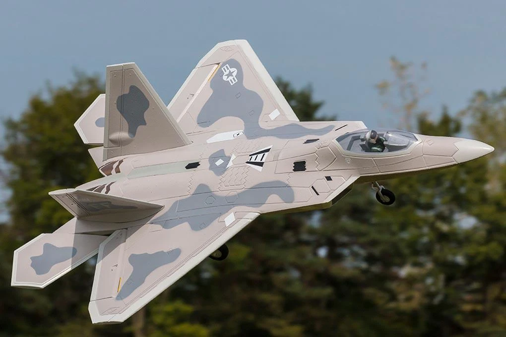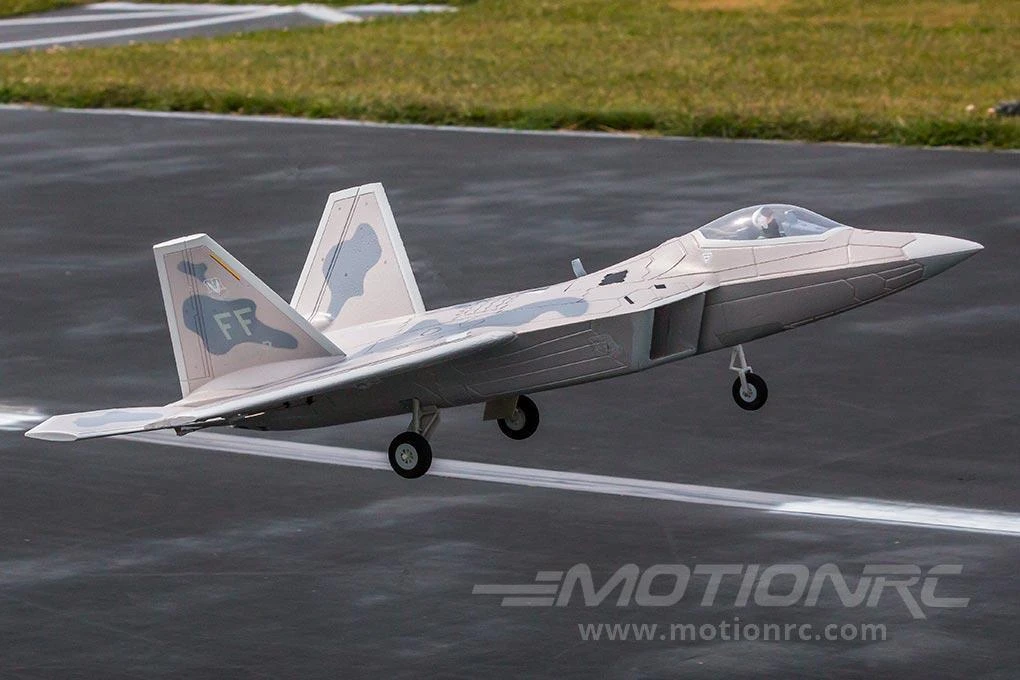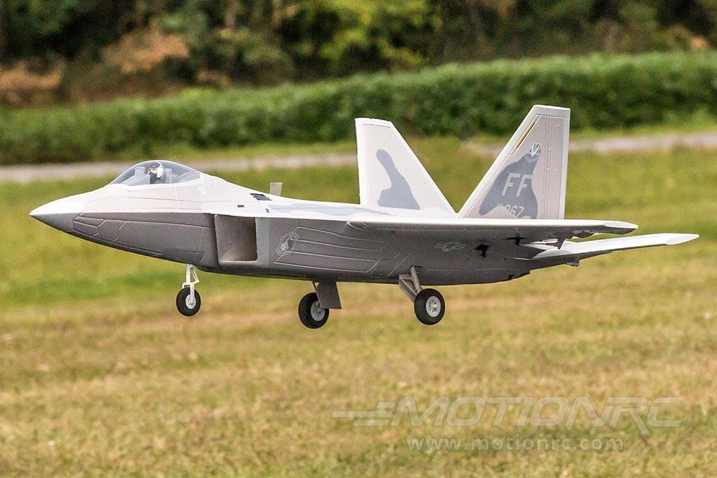 - Fixed, scale landing gear design helps keep the F-22 lightweight and also improves the model’s flying life