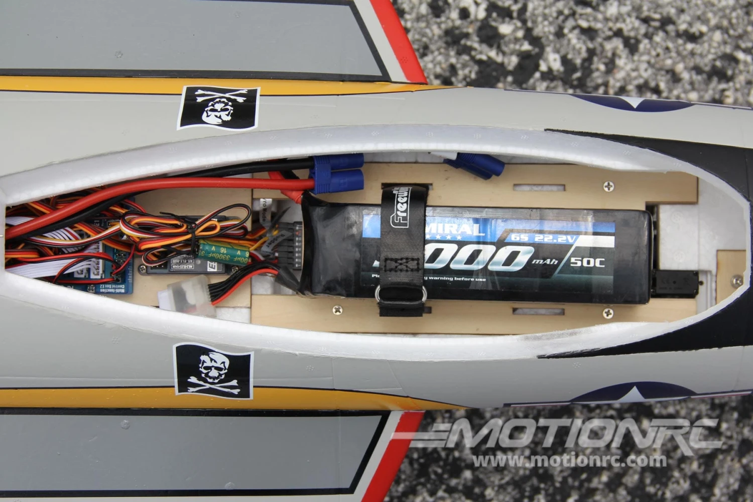 - 6 Cell 22.2V 4000 – 6000 mAh LiPo Battery with EC5 connector – we recommend the Admiral 5000mAh 6S 22.2V 50C LiPo Battery with EC5 Connector