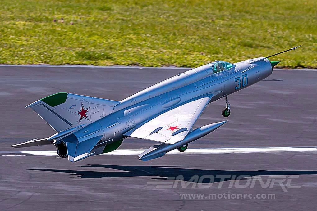 Version Info: This Mig-21 Silver PNP has been upgraded to include a 3658-1920Kv brushless inrunner motor with 9-blade fan for exceptional speed and performance.