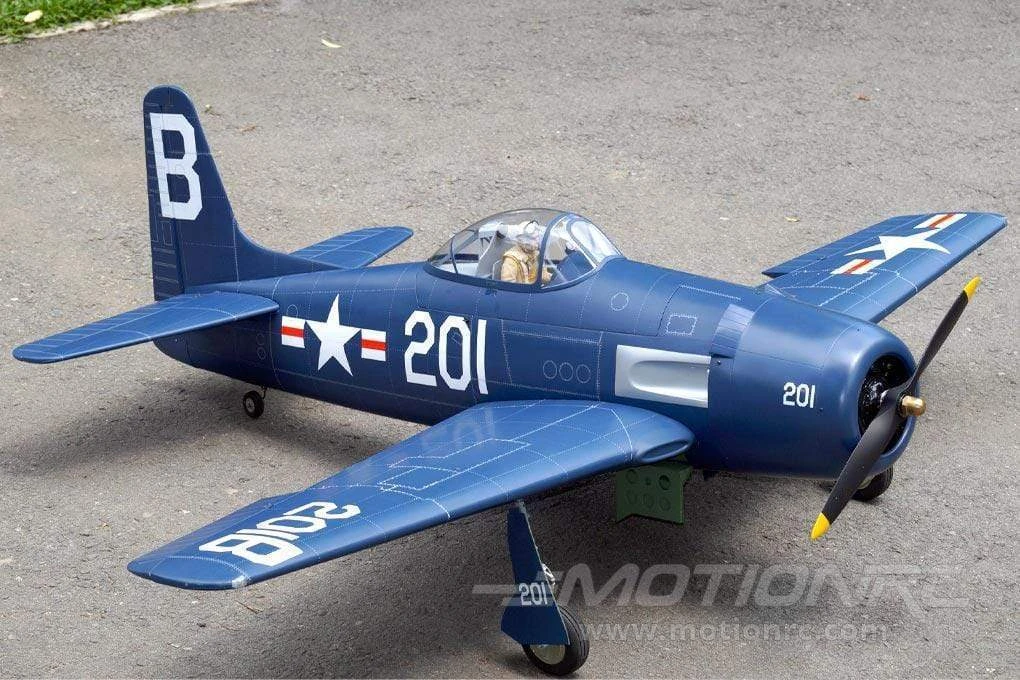 The Nexa F8F Bearcat is a 33cc size electric or gas option scale series warbird with a 2020mm wingspan, constructed primarily from balsa wood and covered with a fuel-resistant covering. This ARF requires assembly and installation of your choice of servos and power system, and includes electric retracts and struts, two piece wing with aluminum wing joiner, flaps, operational gear doors, painted pilot and pre-hinged and installed control surfaces. The large battery hatch affords ample room for either electric or gas setups. An absolute classic at any airfield.
