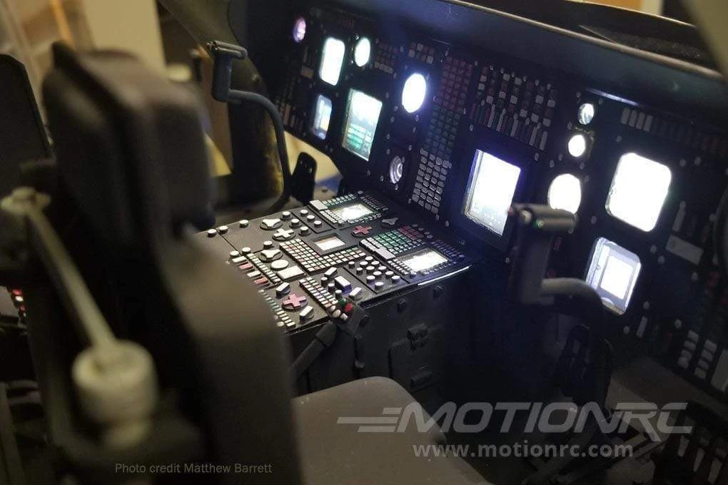 This kit comes with a full scale illuminated detail cockpit with dashboard, joysticks, rudder pedals, aerials, windshield wipers and more. Full rear cabin interiors are included (not installed). Floor and ceiling details can be crafted so once the interiors are installed you have an impressively scaled cockpit/interior.