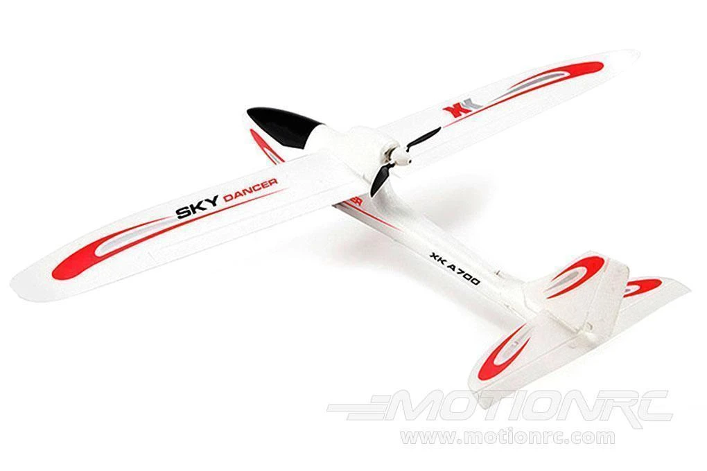 The XK A700 Sky Dancer RTF is a great introductory model aircraft for beginners due to its profile and stability that supports smooth flights and a rigid foam airframe made of EPO foam that is resistant to crash damage. A great park flyer high wing trainer in the micro class size for easy transportation to and from the flying field.